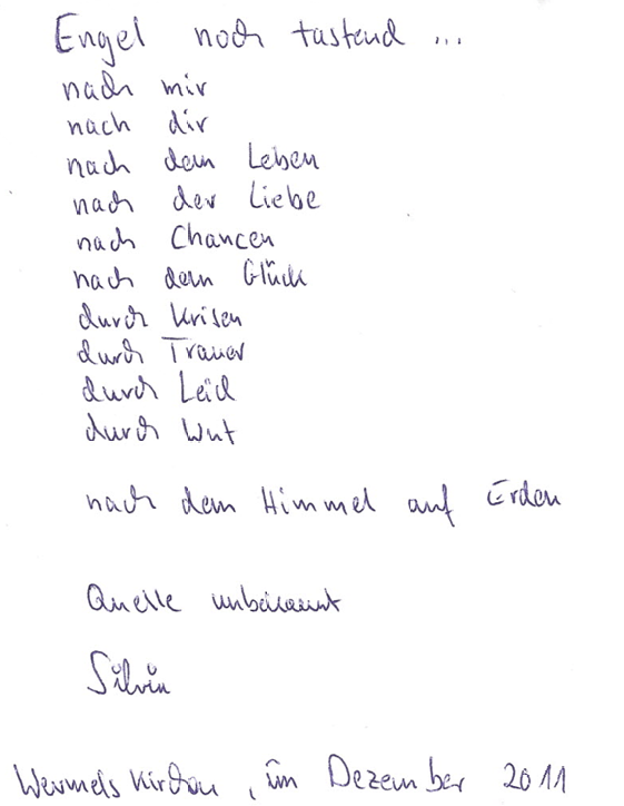 In dankbarer Erinnerung an Silvia Barsties Wermelskirchen,, Gedicht erhalten im Dezember 2011.